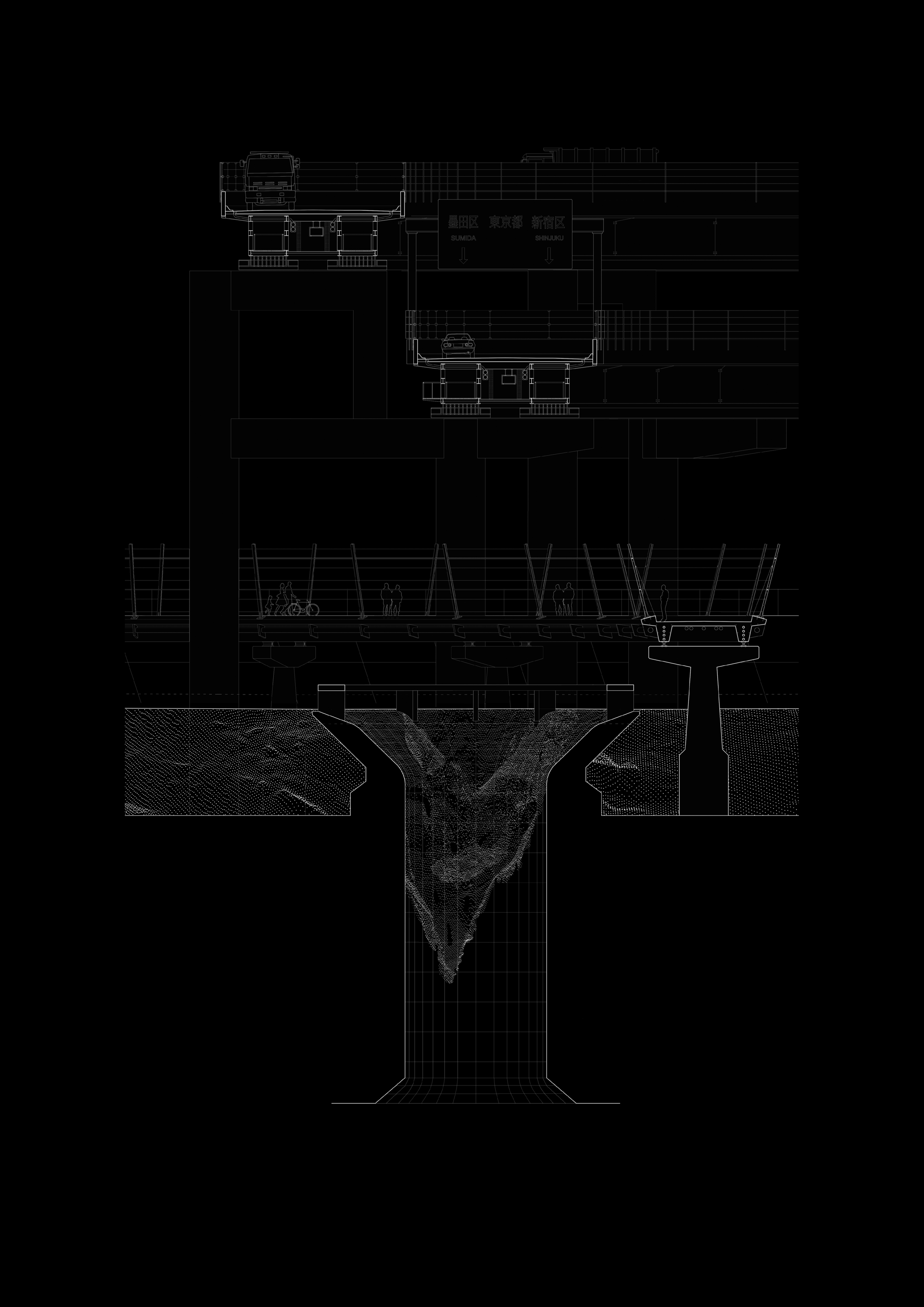 observed from safe distance. Tokyo’s cityscape has developed like a living organism, expanding not only along the rivers and coastline but also into and over them. From the Coastline facing the open ocean to the waterbottle inside a fridge, the flow of water is controlled and engineered. Interactions and experiences with the variable are limited. To prevent Stormsurges and Tsunamis from causing existential Damage, large walls act as shields along the coastline.