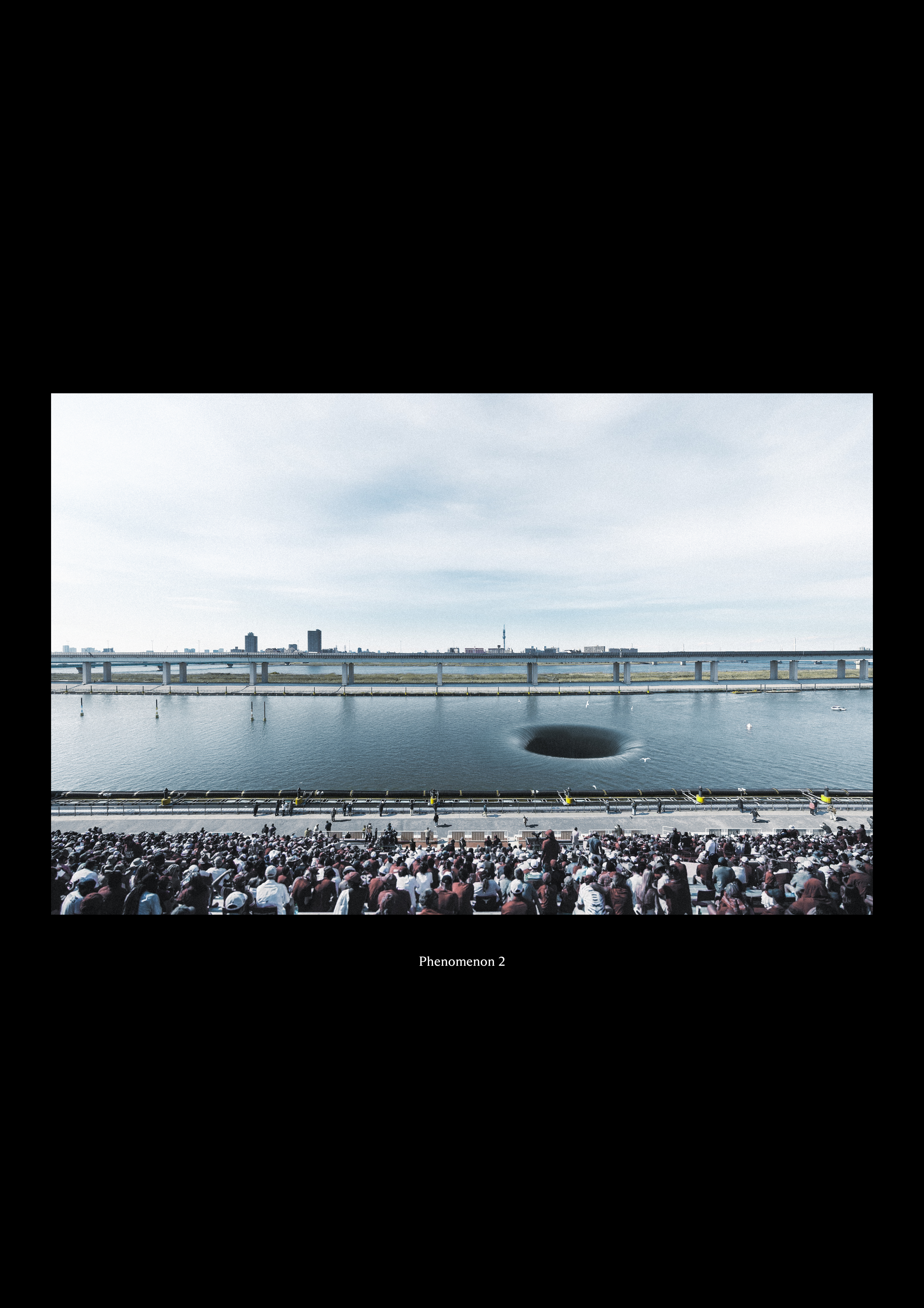Nourished by seasonal rain and snowmelt, the rivers levels are expected to rise due to the changing climate. The implementation of overflow Spillways will soon increase and turn into a regularly reccuring scene. Standing on a bridge one looks down at the edge of a waterfall, into the threshold of water management. A gate to total control, a runoff spillway at the centre of an engineered river. The water reaches maximum height, cascading down into the underground.