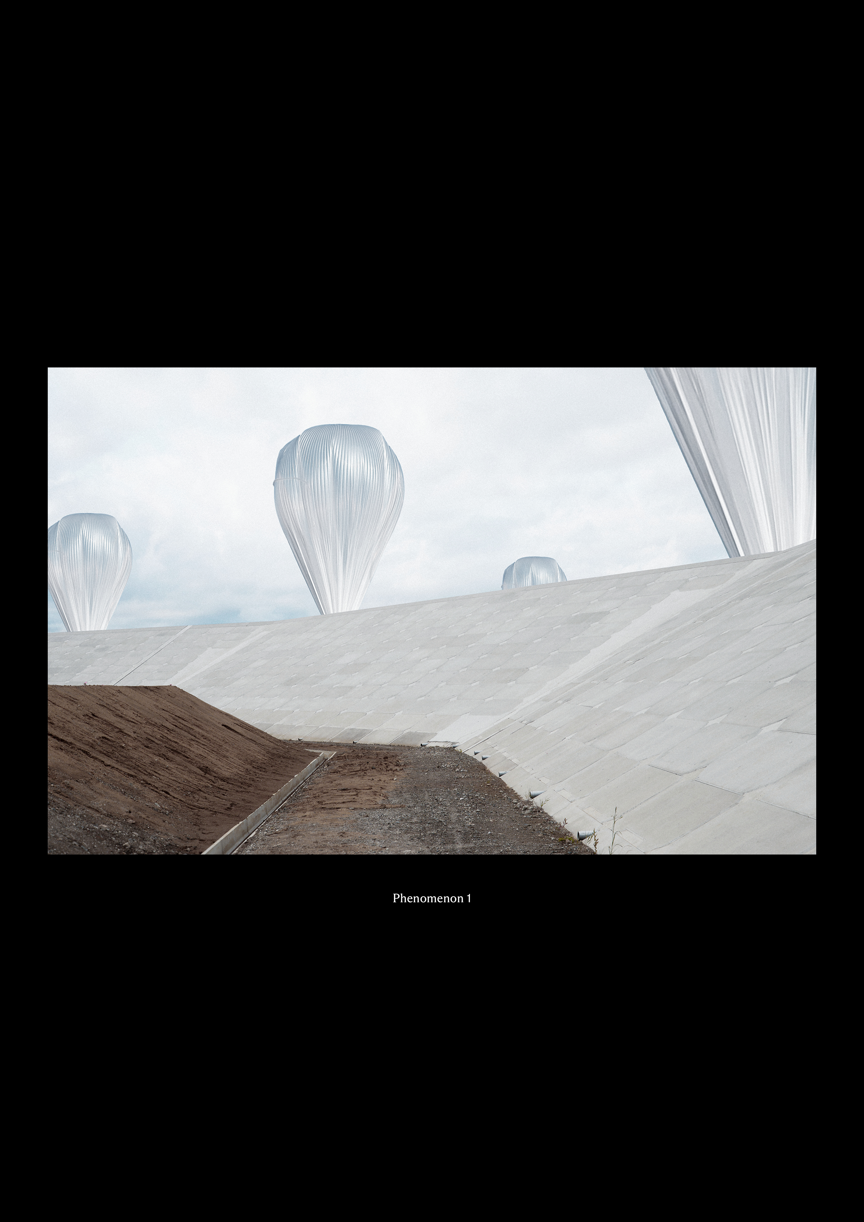 Visible behind the city's massive shields,an inflatable balloon is mounted atop a steel Cone filled with compressed air. The rise and fall of the ocean tides, storm surges or even tsunamis is used as a compressing force, pushing air from the cone into the balloon, inflating and deflating - breathing.The Phenomenon enables the structure to act as an indicator of the water's slightest movements.