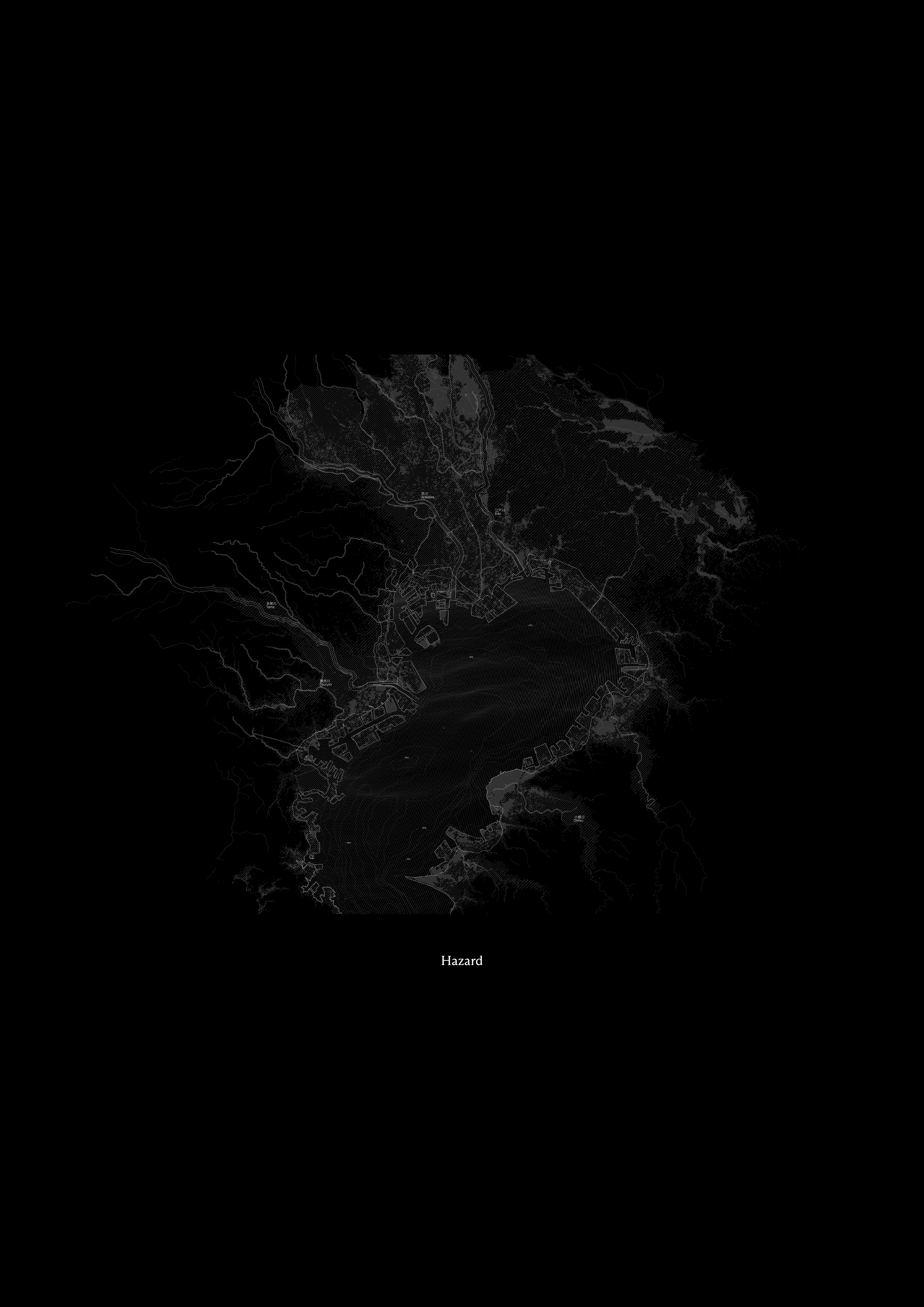 Our Survey maps these underground systems and depicts the hazardous potential of water in the entire Tokyo bay region. In case of rising water levels, both from the ocean and the rivers, large territories of the city are threatened by flooding. To counteract this Hazard, and to generate more land for an over densified mega city, the coastline of tokyo bay has been reworked over centuries. New Canals were built, rivers were straightened and redirected and many areas close to the water are defined by embankments and floodplains.